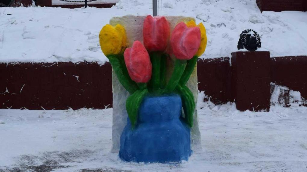 Осуждённые исправительной колонии № 6 в Омской области сделали снежную скульптуру в виде вазы с тюльпанами. Композицию посвятили Международному женскому дню. Арт-объект появился на территории учреждения.